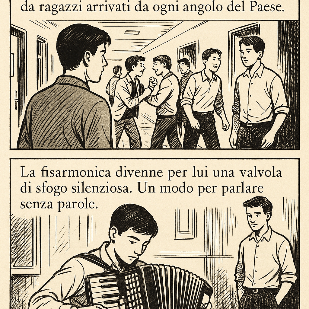 All’inizio, Matteo lo osservava da lontano. Poi un giorno si avvicinò, timido. Sfiorò quei tasti come se temesse di romperli. All’inizio erano solo suoni incerti, goffi. Ma poi le dita cominciarono a muoversi da sole. Non era un talento naturale, ma sentiva che in quelle note c’era qualcosa che gli apparteneva. La fisarmonica divenne per lui una valvola di sfogo silenziosa. Un modo per parlare senza parole.