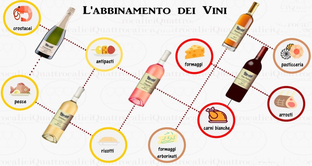 Per ogni tipo di portata, abbiamo visto quali sono i migliori vini in abbinamento, ma quali sono i cibi che maggiormente si adattano all’abbinamento con le varie tipologie di vino? A seconda della tipologia di vino in degustazione esistono diversi criteri per selezionare le migliori categorie di piatti in accompagnamento. Per i vari tipi di vini, potremo individuare le seguenti tipologie: