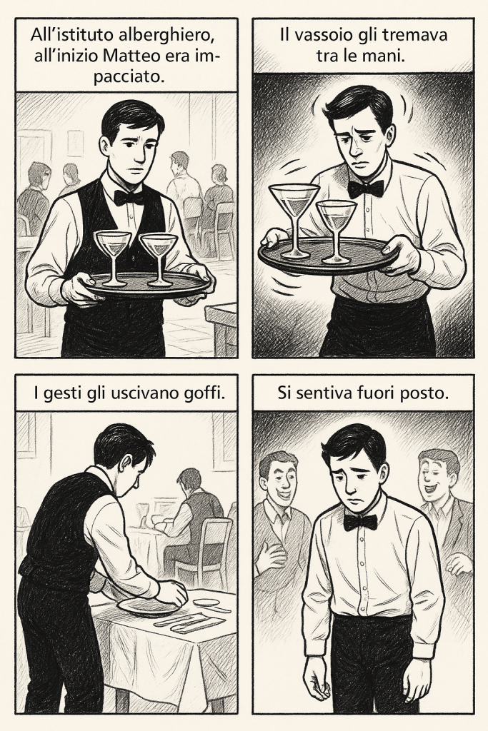 Fin dal primo giorno di pratica, Matteo si accorse che quello che sapeva con la testa, non bastava al corpo. Il vassoio gli tremava tra le mani. I bicchieri sembravano voler saltare giù da soli. I piatti gli sfuggivano, le posate sembravano sfuggire a ogni logica. I gesti, che dovevano essere fluidi ed eleganti, gli uscivano rigidi, scoordinati, goffi.