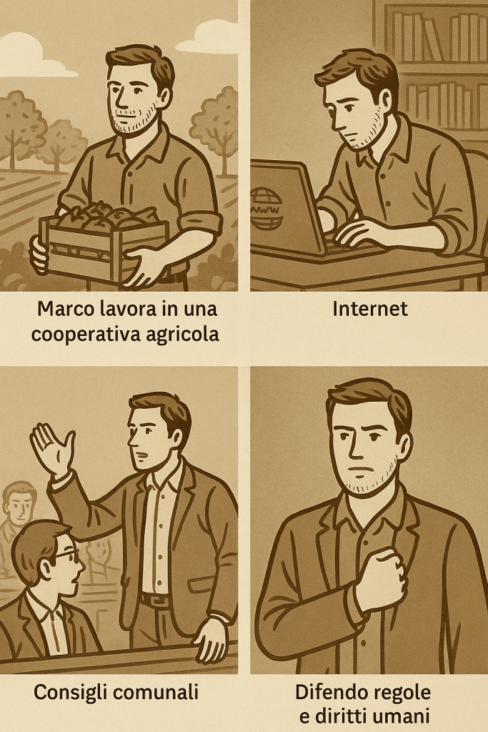 Marco lavora in una cooperativa agricola, fa formazione per ragazzi con difficoltà, partecipa alle riunioni comunali anche quando non lo ascolta nessuno.