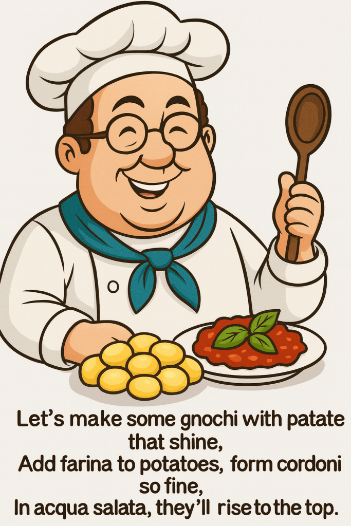 Gli gnocchi di patate sono uno di quei piatti che sanno di casa, di domenica in famiglia, di profumo di basilico e di sugo che sobbolle piano. Questa volta, però, vi propongo non solo una ricetta, ma anche una canzone dedicata… perché in Abruzzo la cucina non si prepara soltanto: si canta! 🎶