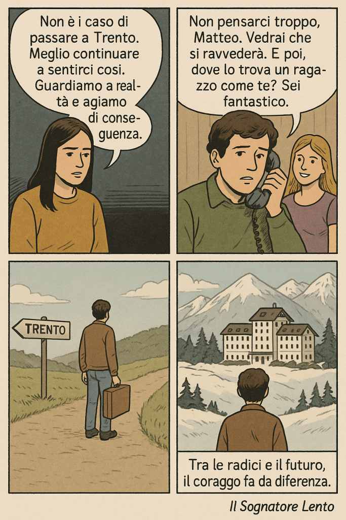 Ma la sua voce era diversa dal solito. Non era la solita intonazione vivace e affettuosa: c’era un velo di distanza, quasi di rassegnazione. Dentro di me lo sentii subito, come una lama sottile. Capivo che non era facile per lei, come non lo era per me. Ma in quelle parole c’era anche rispetto, e forse orgoglio. Mi resi conto che la vita ci stava già portando a crescere in direzioni diverse: lei con il ritorno a Trento per gli studi, io con una nuova stagione di lavoro sulle montagne del Piemonte.