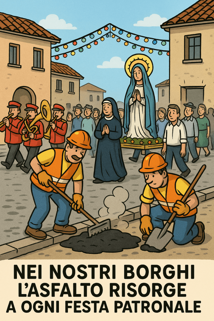 👉 Nei nostri borghi l’asfalto ha un calendario liturgico: risorge a Ferragosto e torna a sparire con la fine delle feste patronali.