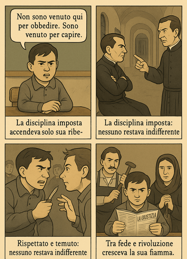 La sua vera passione, però, non erano le risse né i voti scolastici. Erano i libri e i giornali. Non solo quelli imposti dal programma, ma soprattutto quelli che parlavano di politica, di rivoluzione, di giustizia sociale. In biblioteca cercava testi che andavano oltre la sua età; nelle edicole comprava fogli che nascondeva sotto i manuali. Leggeva Marx, i socialisti italiani e francesi, i grandi pensatori che parlavano di popolo e di rivolta. Quelle idee gli entravano dentro con la forza di verità.