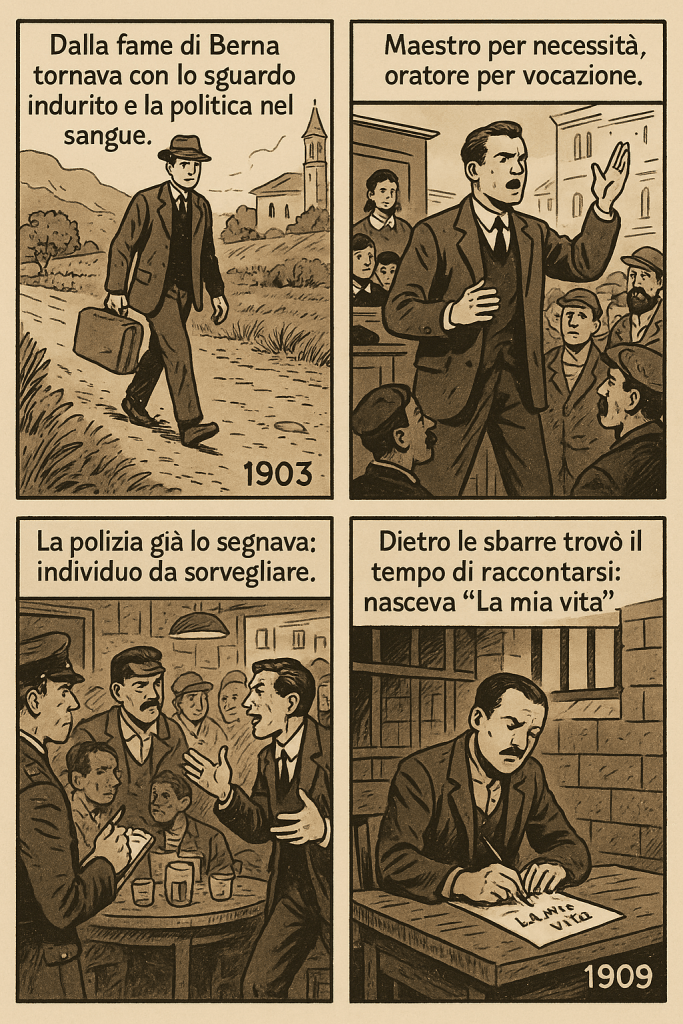 L’Italia lo accolse di nuovo nel 1904, con le stesse strade polverose e gli stessi campi che aveva lasciato due anni prima. Ma Benito non era più lo stesso ragazzo. L’esperienza svizzera, con la fame, le notti all’aperto e il carcere di Berna, gli aveva indurito lo sguardo. Tornava con la certezza di aver scelto una strada: quella della politica e della lotta.