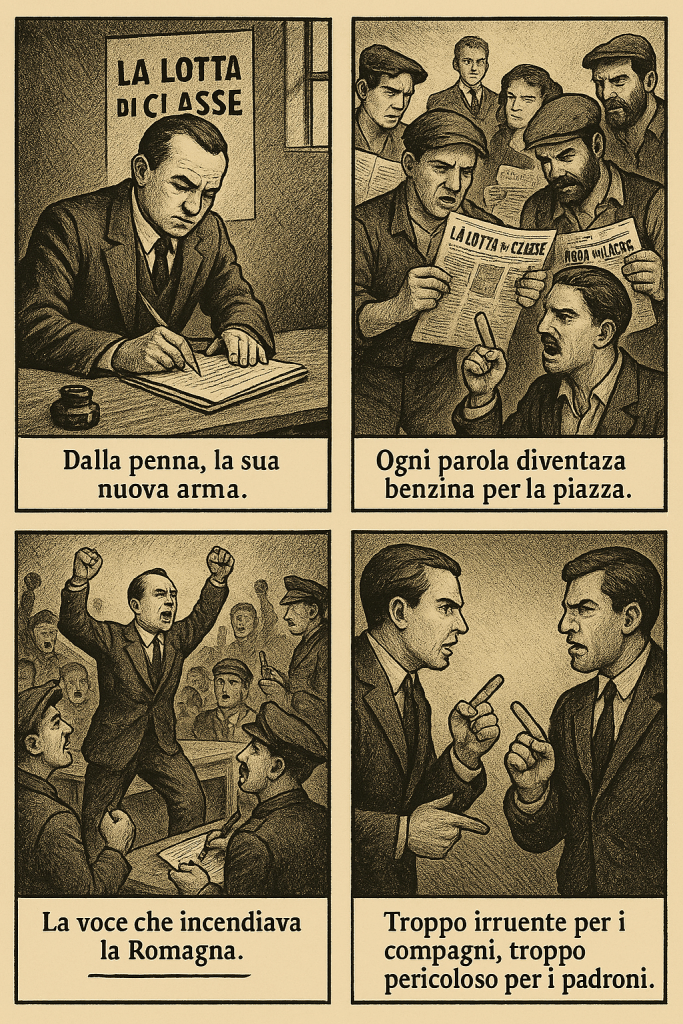 A Forlì esisteva già un foglio socialista, fragile e poco seguito. Benito vi collaborò, poi lo prese in mano e lo trasformò nella sua tribuna. Lo intitolò con due parole semplici e definitive: La Lotta di Classe.