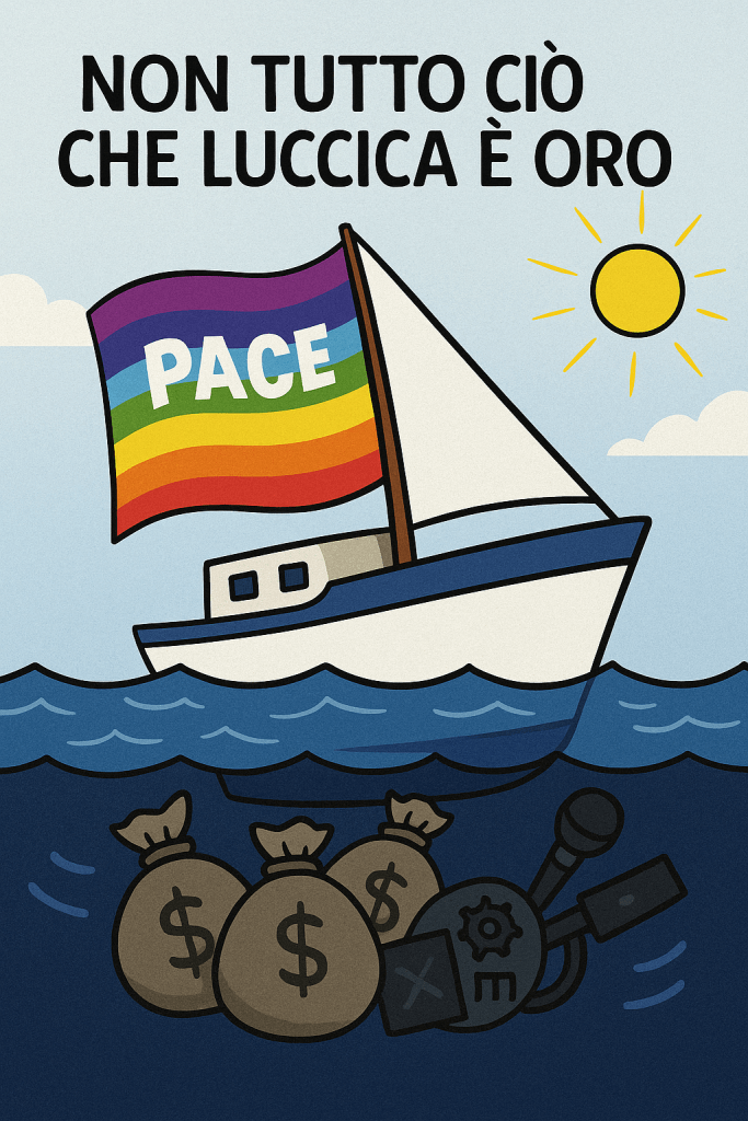 Il vero nodo sta qui: alla gente comune viene consegnata solo la facciata dorata. Il pacifismo come immagine, la generosità come spettacolo, la protesta come racconto eroico. Quello che resta nascosto sono gli interessi sottocoperta: la propaganda, le carriere, i fondi, i calcoli geopolitici.