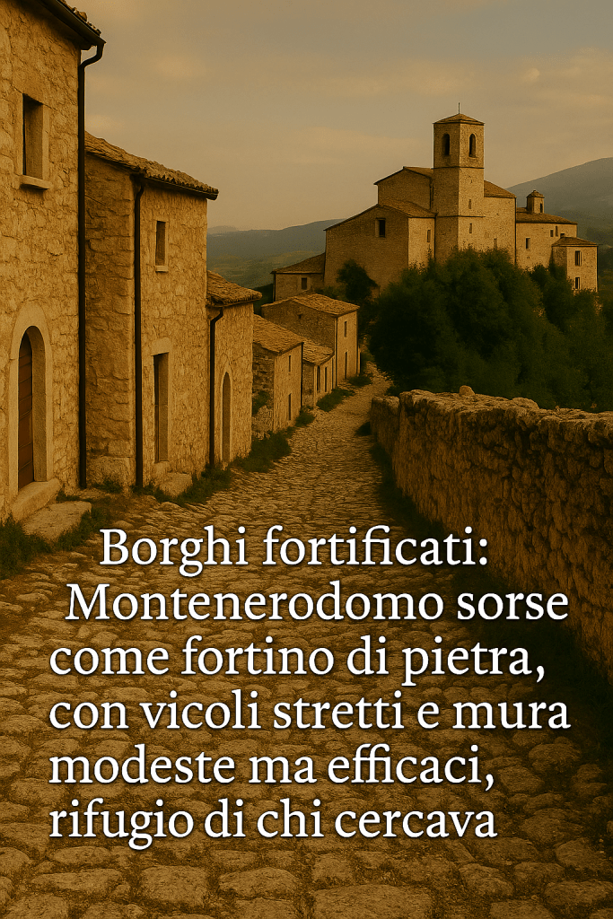 Nel Medioevo i borghi non erano pensati per il turismo, ma per la sopravvivenza. Montenerodomo, come altri paesi abruzzesi, si raccolse attorno a un nucleo centrale con case in pietra addossate, vicoli stretti e porte d’accesso. Le mura non erano tanto monumentali quanto funzionali: bastava rendere difficile l’ingresso agli invasori.