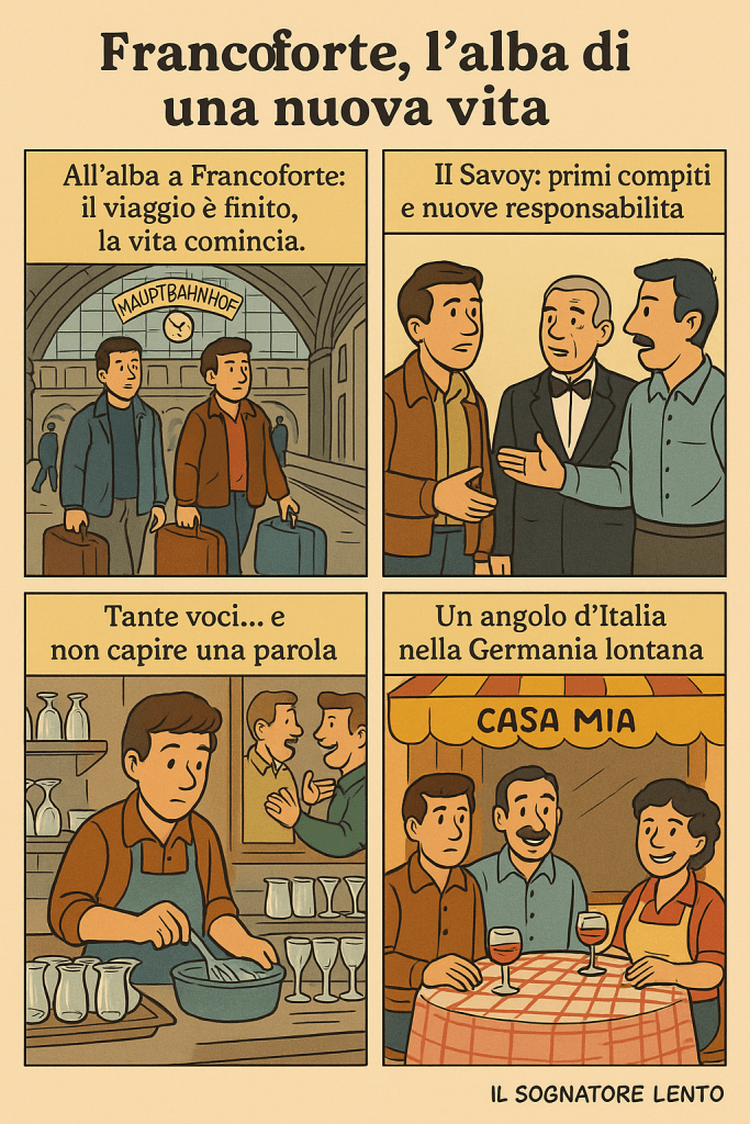 Quando il treno entrò alla stazione di Francoforte, era ormai l’alba. Stanchi e assonnati, ma con il cuore in tumulto, Matteo e Antonio scesero dal convoglio. L’aria era diversa: fredda, umida, impregnata di odori nuovi, tra fumo di carbone e profumi sconosciuti delle prime colazioni tedesche.