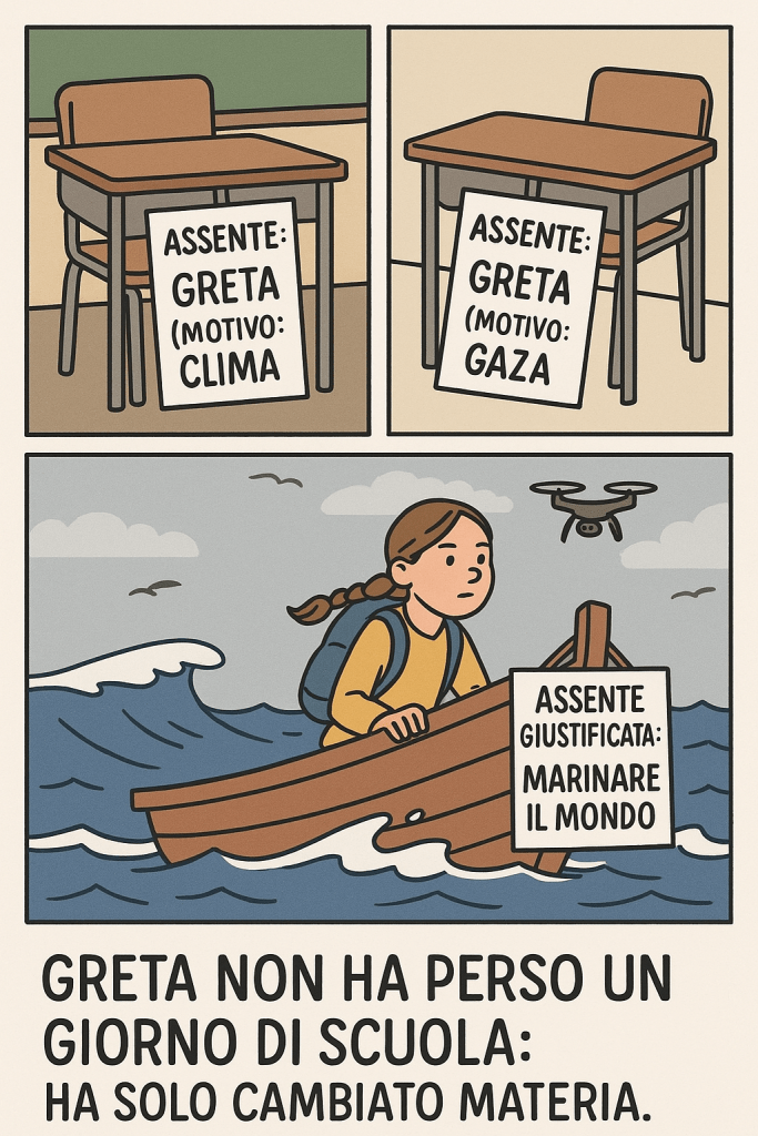 Greta Thunberg non ha più un registro da firmare, ma continua a vivere come se fosse sempre al primo giorno di scuola… bigiato. A 15 anni saltava le lezioni per il clima, a 22 salta le convenzioni per imbarcarsi sulla Global Sumud Flotilla. Ormai più che attivista, sembra una professionista del marinare: non una studentessa, ma una “marinara a tempo pieno”.