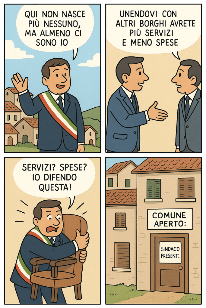 Finché la carica di sindaco verrà percepita e vissuta come un “posto di lavoro”, sarà quasi impossibile convincere gli amministratori a rinunciare al proprio ruolo per il bene collettivo. Perché la sopravvivenza del borgo sembra contare meno della sopravvivenza della poltrona.