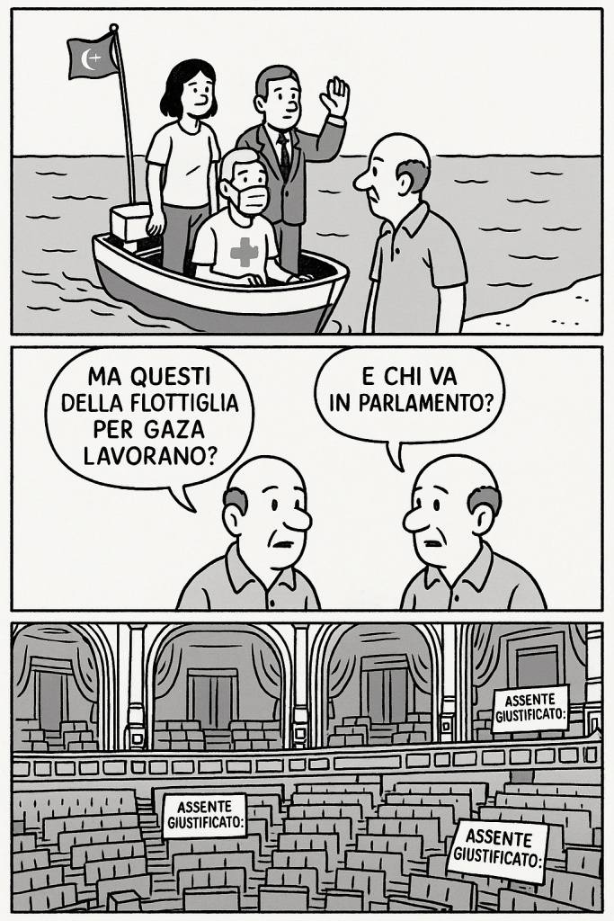 Ora, senza nulla togliere alle cause nobili, ma viene da chiedersi: se il parlamentare è a Gaza, chi va in Parlamento? La risposta è semplice: nessuno. Ma tanto lì non se ne accorge nessuno, perché l’aula vuota è diventata la normalità. E forse, paradossalmente, a Montecitorio ci sono più assenze che a bordo delle navi.
