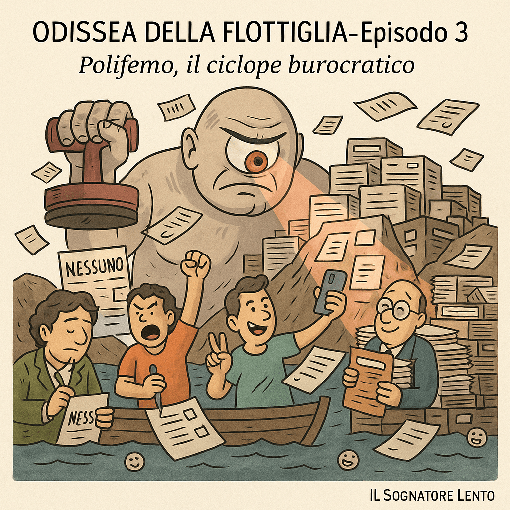 La flottiglia lasciò l’isola del ciclope burocratico come si esce da un incubo firmato e timbrato in triplice copia.