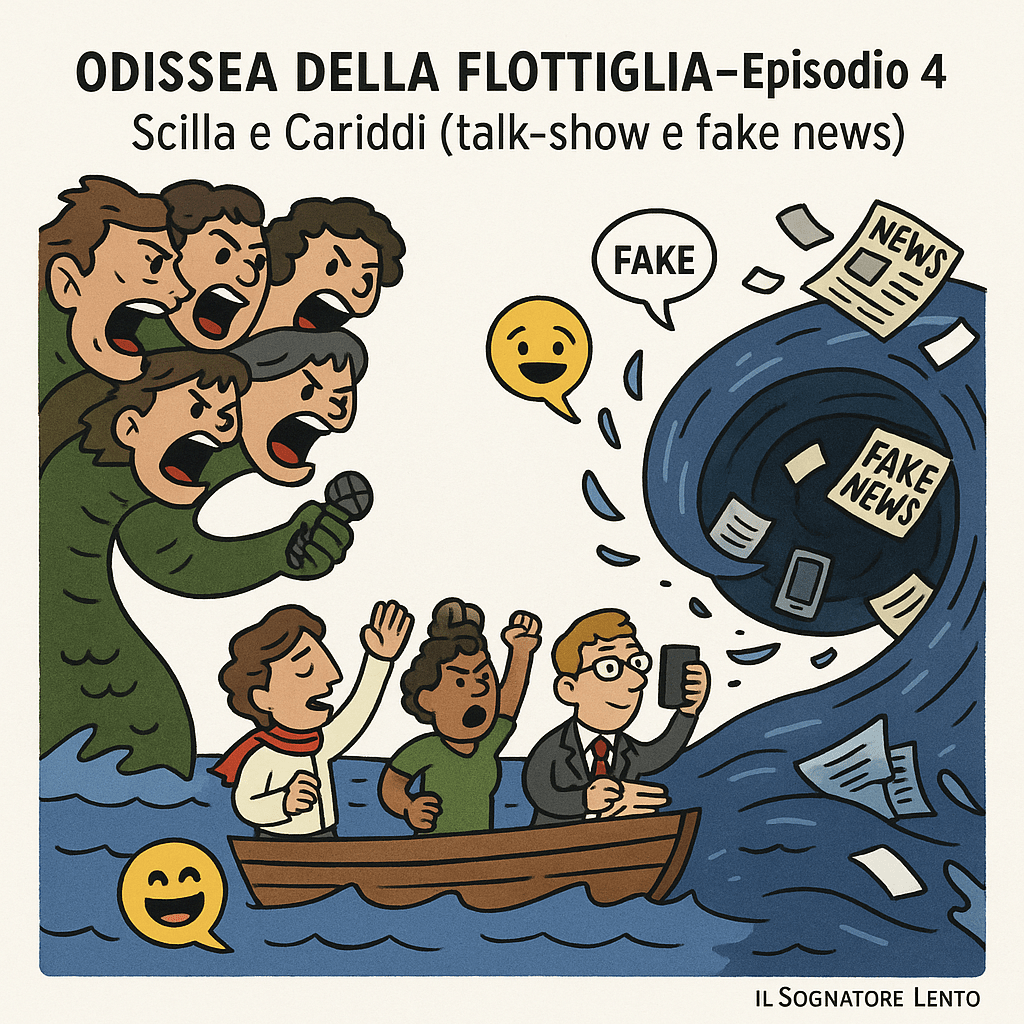 La flottiglia capì che non c’era via d’uscita facile. Restare fermi significava affondare. Passare troppo vicino a Scilla significava essere sbranati dalle urla. Avvicinarsi a Cariddi voleva dire essere risucchiati dalle fake news.