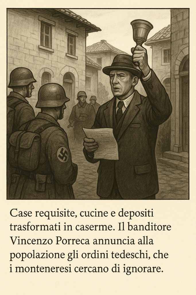 L’allora podestà fu costretto a provvedere in 24 ore al rifornimento di vettovaglie di ogni genere e ad assicurare la piena assistenza agli occupanti. Per dare forza agli ordini, i tedeschi incaricarono il banditore del paese, Vincenzo Porreca, di trasmettere pubblicamente le richieste alla popolazione.