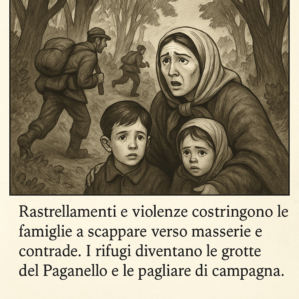 Molti trovarono rifugio nel bosco di Paganello, nelle grotte naturali e perfino nelle pagliare, le costruzioni di fortuna che in tempi normali servivano ai contadini per ripararsi dalla pioggia durante il lavoro nei campi.