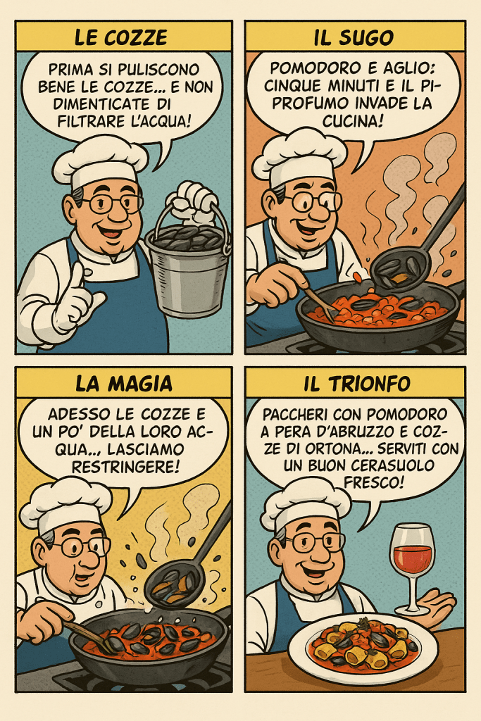 I paccheri si adagiano sul piatto come abbracci lenti, avvolti dal rosso vivo del pomodoro e dal profumo salmastro delle cozze di Ortona. Ogni assaggio è un incontro di mare e terra, un ricordo d’estate che non finisce mai. Un filo di prezzemolo accende il verde della speranza, mentre un calice di Cerasuolo vibra accanto, come un brindisi d’amore.