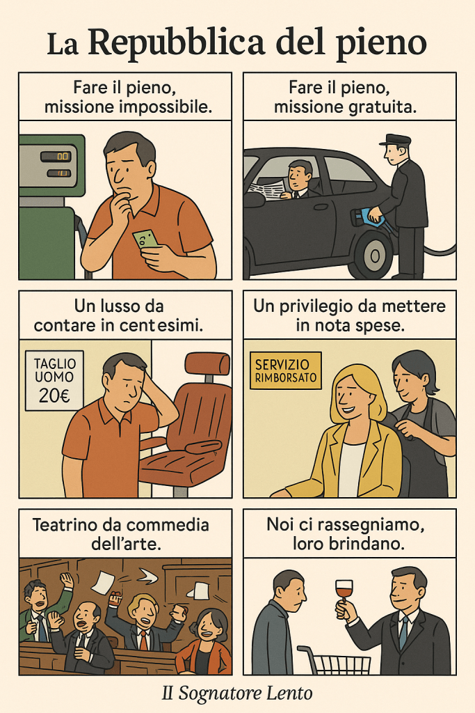 Noi ci chiediamo come risparmiare 10 euro di carburante, loro discutono se l’auto blu debba avere il frigo per lo champagne o basti per l’acqua tonica.