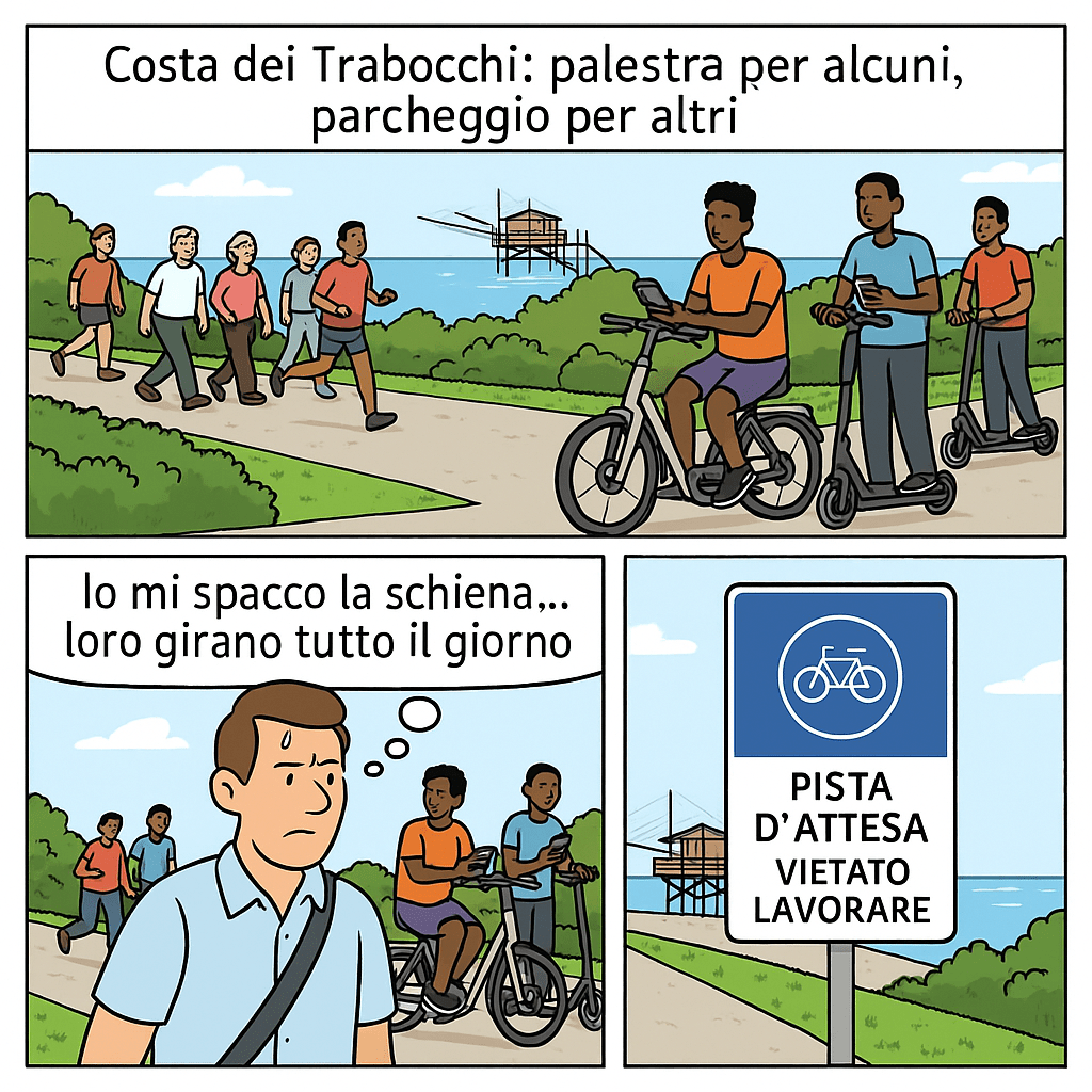 Camminando lungo la pista ciclabile della costa dei Trabocchi, tra Fossacesia e Torino di Sangro, la scena si ripete sempre uguale: famiglie che passeggiano, sportivi che corrono, ciclisti che si allenano. E poi gruppi di giovani stranieri, spesso ospitati in strutture alberghiere adattate a centri di accoglienza, che passano il tempo in bicicletta elettrica, su un monopattino o seduti in compagnia, con lo smartphone in mano.