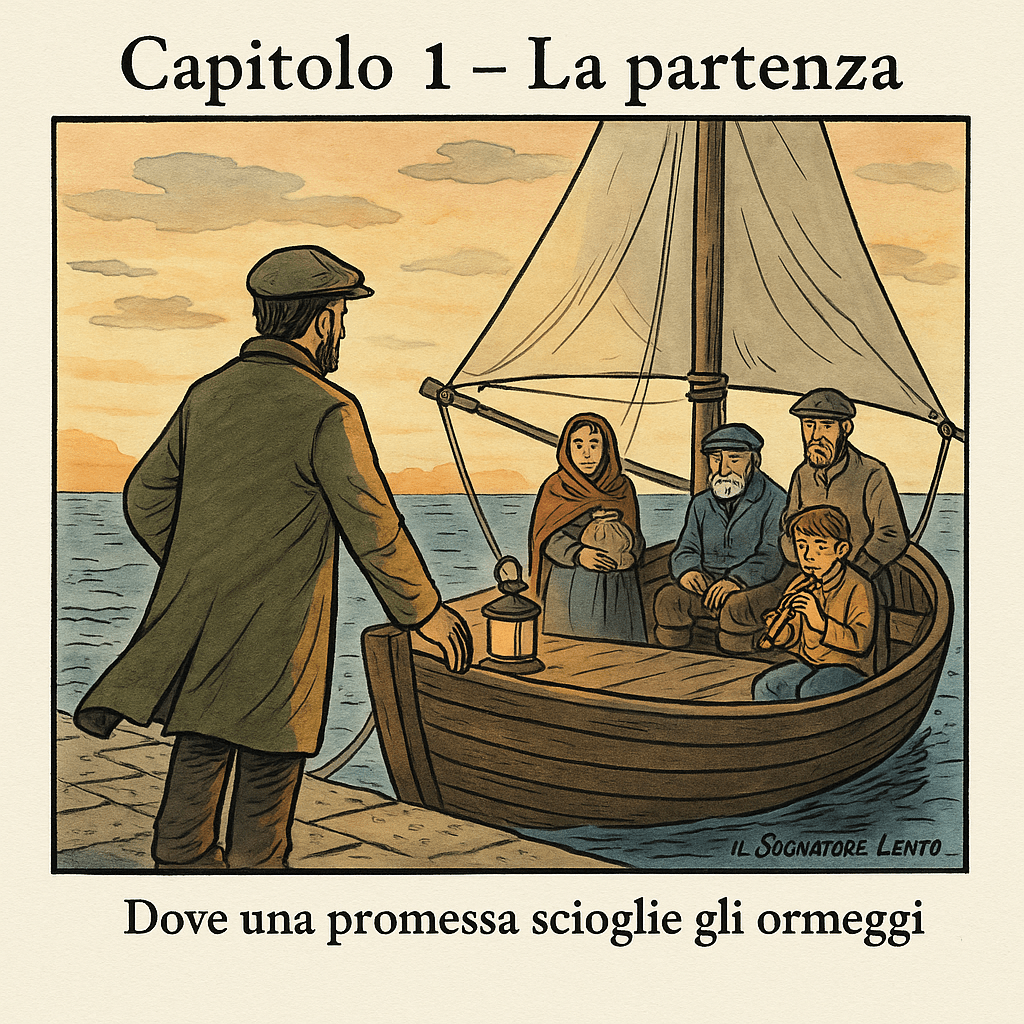 ➤ L’alba arrivò senza clamori: una lama chiara sul profilo dell’acqua, il molo umido di sale, il legno che, a ogni passo, restituiva un cigolio antico. Il Viaggiatore si fermò un istante prima di salire a bordo. Pose la mano sulla murata, come si saluta un amico. «Non parto per fuggire, né per conquistare» mormorò. «Parto per mantenere una promessa.»