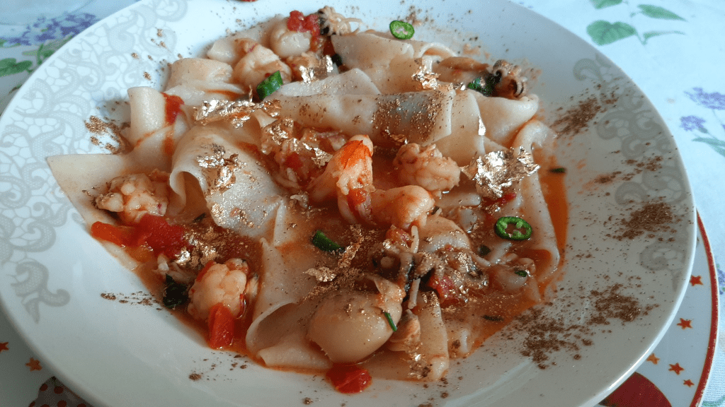 Completa con prezzemolo, peperoncino, polvere e trucioli dâoro. â¨