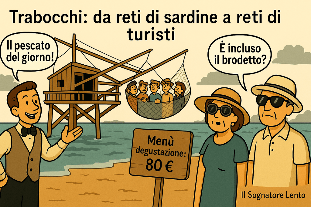 La satira ci fa sorridere dei menù gourmet e dei selfie al tramonto. Ma sotto l’ironia resta una certezza: senza questa metamorfosi, forse oggi parleremmo dei trabocchi solo al passato.