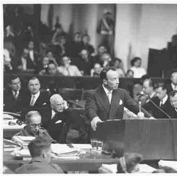François de Menthon parla al Tribunale a nome della Francia durante il processo di Norimberga per crimini di guerra. Donatore: Robert Jackson.