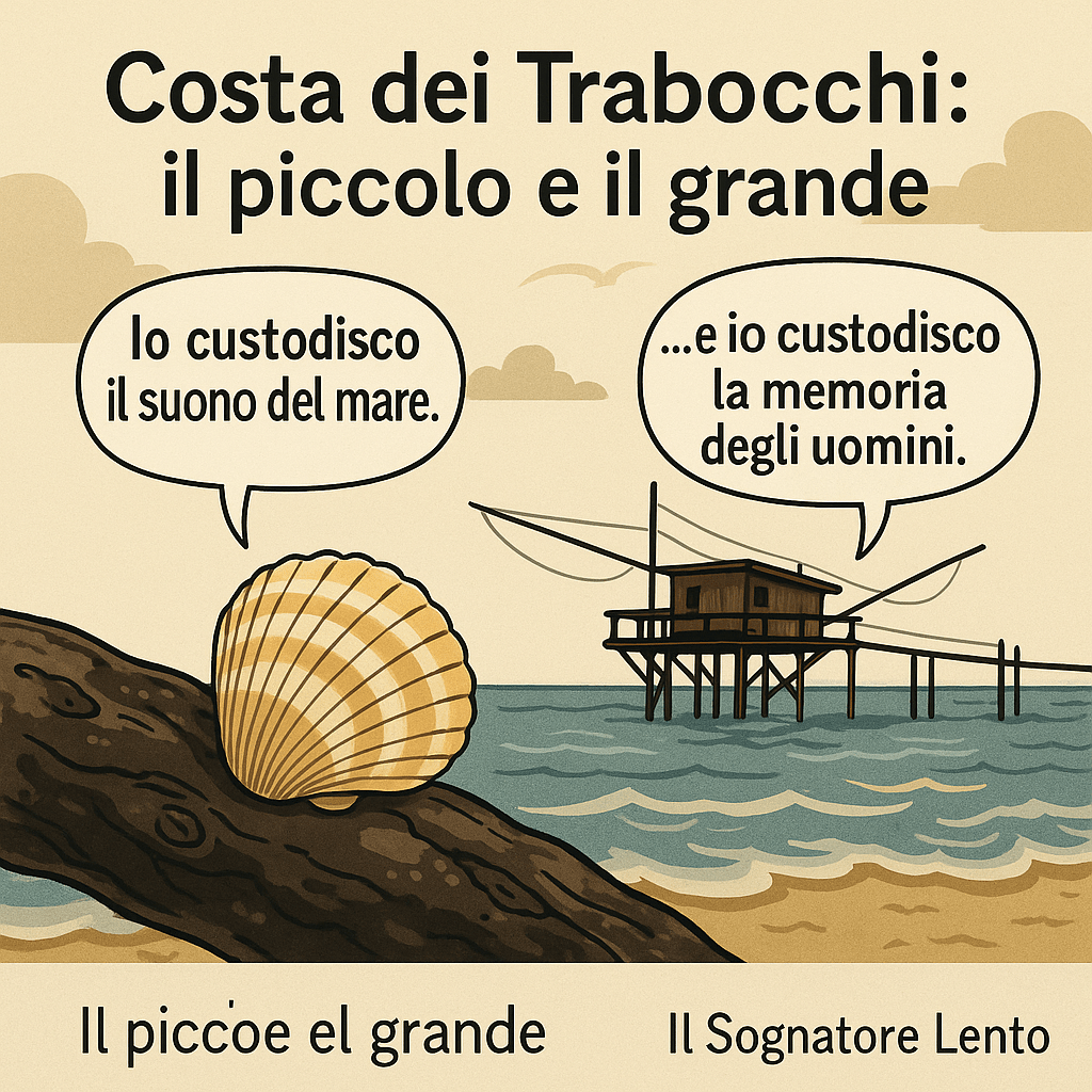 Una conchiglia e un trabocco. Due simboli che sembrano lontani, ma che insieme raccontano la stessa verità: la grandezza di un territorio sta nella capacità di custodire il piccolo e il grande, il fragile e il resistente, il dono della natura e l’ingegno dell’uomo.