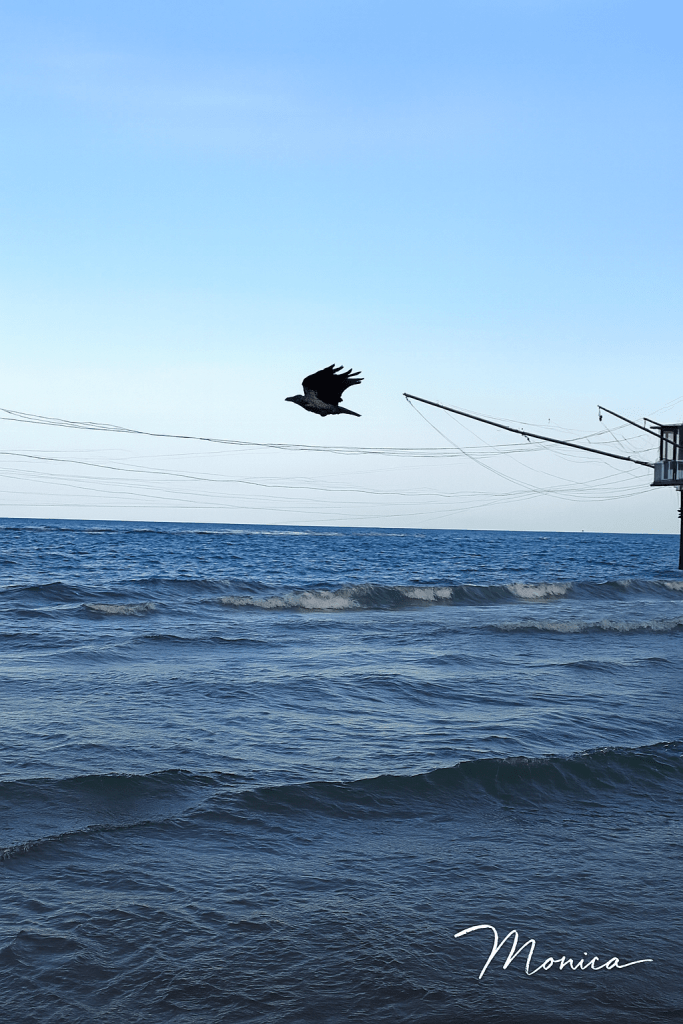 Ci sono immagini che restano impresse non per la perfezione estetica, ma per la forza simbolica che racchiudono. Un trabocco, sospeso tra legno e mare, e una cornacchia che vola sopra le sue reti: due mondi diversi che, per un istante, si incontrano nello stesso orizzonte.