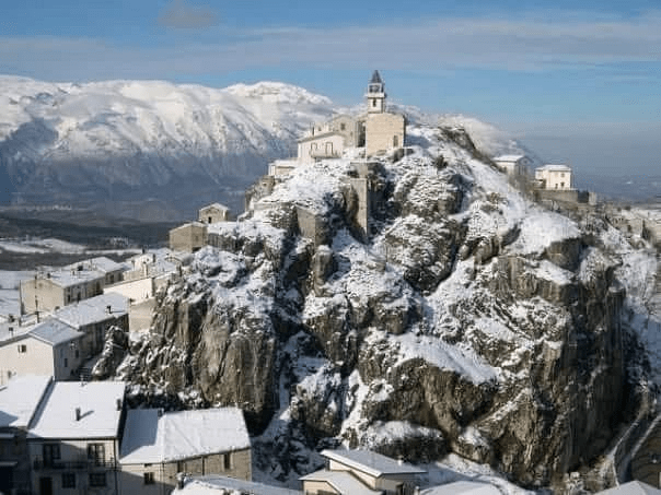 A 1.165 metri d’altezza, su una rupe di pietra scura, il borgo sembra sospeso tra cielo e Maiella. Cinquecento anime appena, ma abbastanza per custodire radici, memorie e ritorni. Qui l’inverno non è soltanto stagione: è carattere. L’estate, invece, è festa che riporta chi è partito e non ha mai smesso di sentirsi di casa.