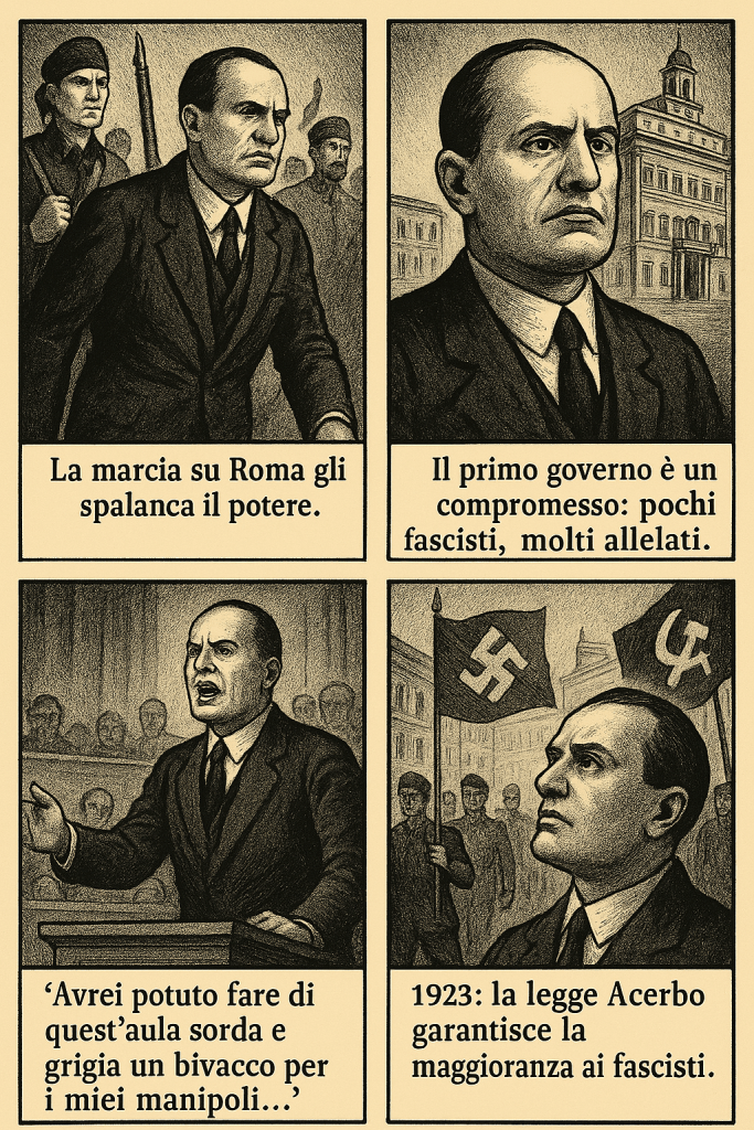 Il primo governo Mussolini fu ancora un compromesso, un ministero di coalizione con poche poltrone fasciste e molte concessioni ai liberali e al re. Ma dietro quella prudenza si nascondeva già la strategia del futuro.