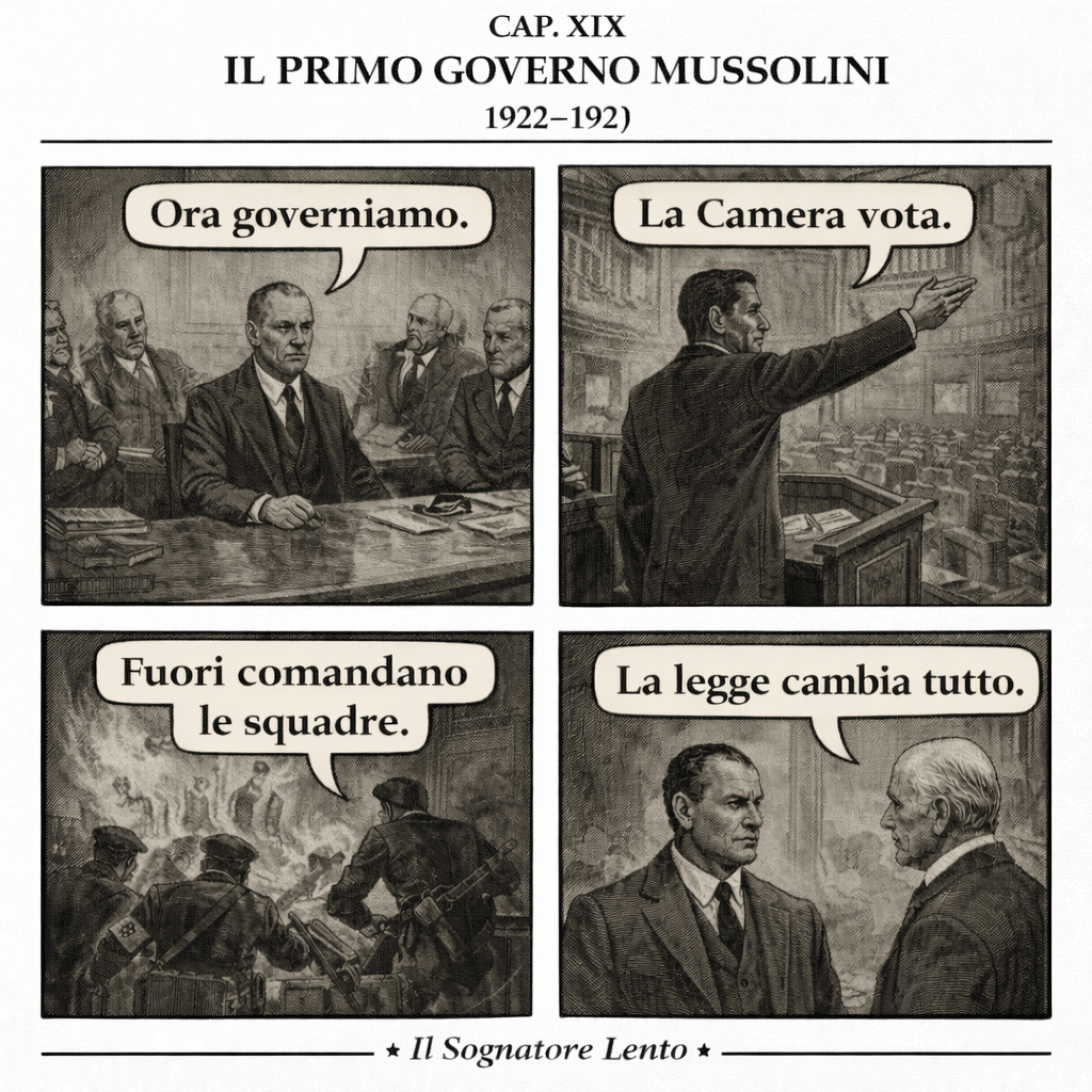 Il suo primo governo non era ancora fascista nel senso pieno della parola. Dentro sedevano liberali, popolari, nazionalisti, militari, tecnici. I fascisti erano pochi nei ministeri, quasi una minoranza. Eppure Mussolini non si illuse e non si lamentò.