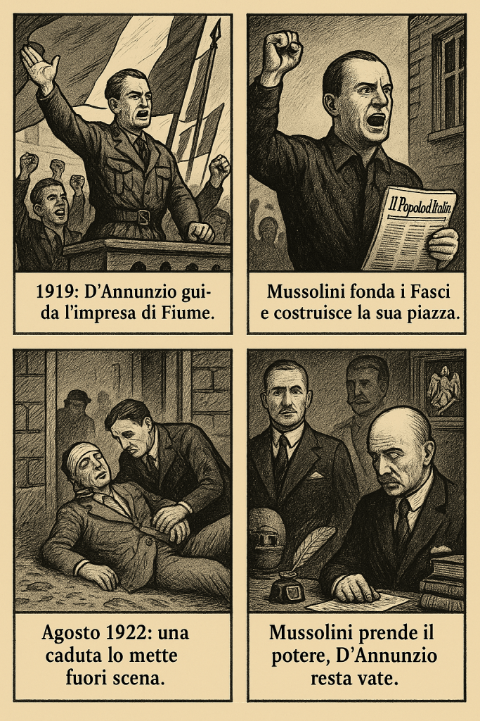 D’Annunzio inventò i simboli, le liturgie, lo stile scenico. Mussolini trasformò tutto questo in politica concreta e in regime.