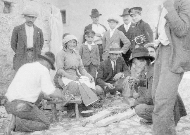 Abruzzo, anni ’30 – Un gruppo di contadini e pastori prepara i primi arrosticini.