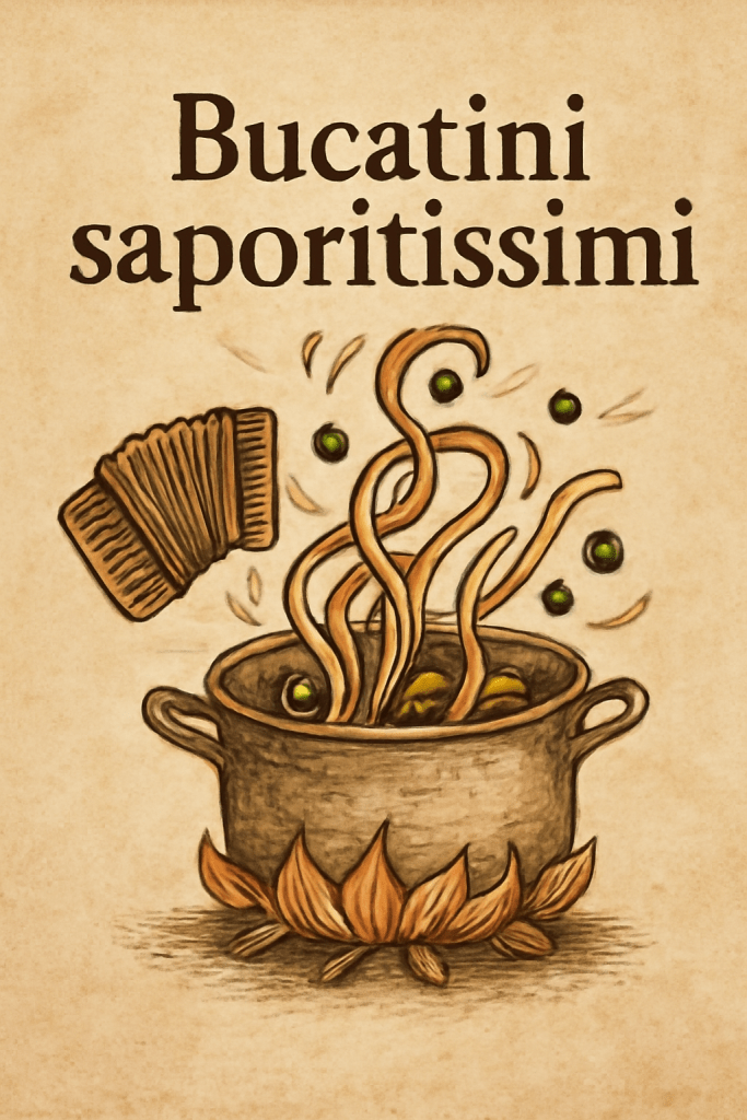 Nel frattempo, lessate i bucatini in acqua salata e scolateli al dente. Versateli nella padella con il condimento e fateli saltare a fuoco vivo per qualche istante, rigirandoli con un gesto deciso ma affettuoso.