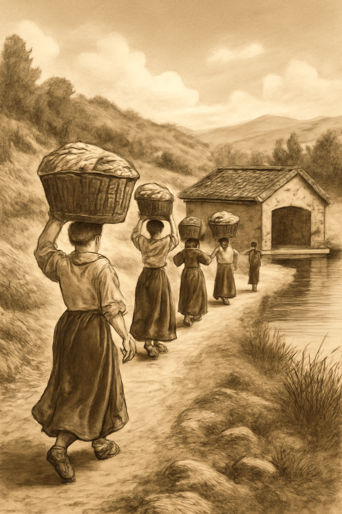 Le donne partivano presto, spesso all’alba, con grandi ceste di vimini o sacchi di tela colmi di lenzuola e vestiti. Le caricavano sulle spalle, sul capo o, quando era possibile, sul dorso di un asino, e percorrevano strade dissestate e ripide, affrontando il gelo d’inverno e la polvere d’estate. Arrivate al torrente, si inginocchiavano sulle pietre lisce levigate dall’acqua e cominciavano a strofinare i tessuti con saponi fatti in casa, ottenuti da grasso animale e cenere. Ogni macchia tolta era un piccolo trionfo. L’acqua era gelida, le mani si screpolavano fino a sanguinare, ma nessuno si lamentava: era un lavoro necessario, che dava dignità alla casa e decoro alla famiglia.