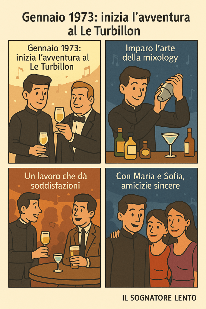 A metà gennaio, come previsto, Matteo lasciò la sala del Savoy per iniziare a lavorare nella discoteca dell’albergo, il Le Turbillon. Fu una separazione silenziosa da Antonio, che rimase in sala, ma senza allontanarsi del tutto: entrambi facevano ancora parte dello stesso grande ingranaggio del Savoy, seppure in reparti diversi.