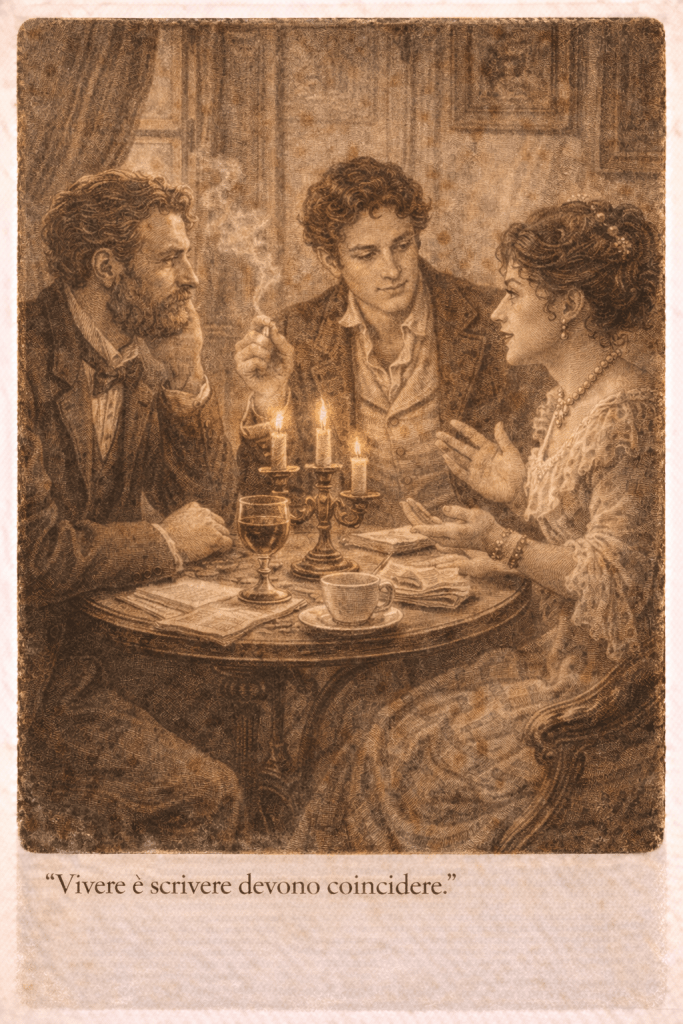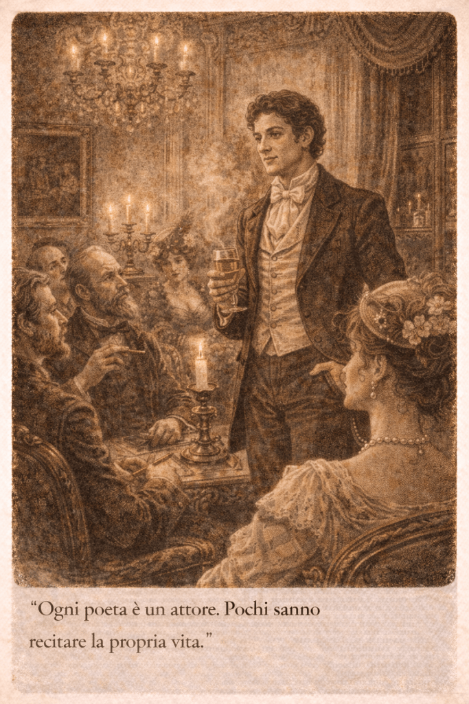 D’Annunzio, con i suoi abiti curati e la parola precisa, divenne presto una presenza ricercata. Sapeva ascoltare, osservare, rispondere con ironia. Recitava versi, ma soprattutto recitava se stesso.