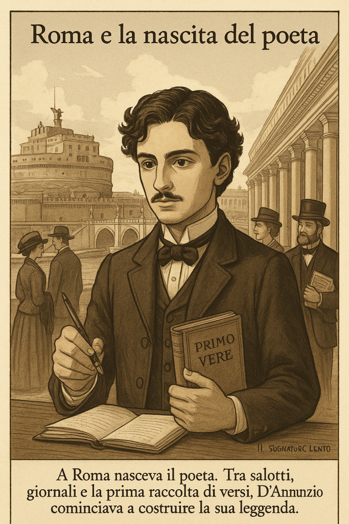 D’Annunzio capisce che la fama è un’arte e la coltiva con cura: si veste con eleganza, cita in latino, scrive con passione.