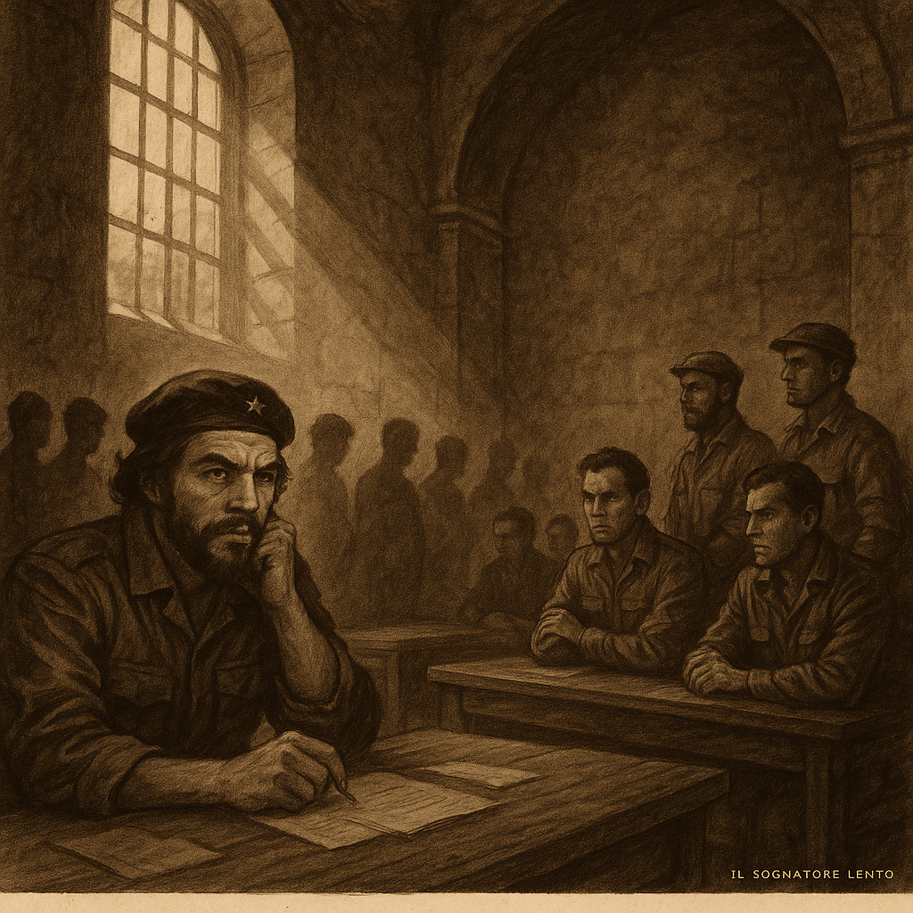 Nella grande sala di pietra della fortezza, tra archi e lampade sbiadite, Ernesto Guevara sedeva al tavolo del tribunale.