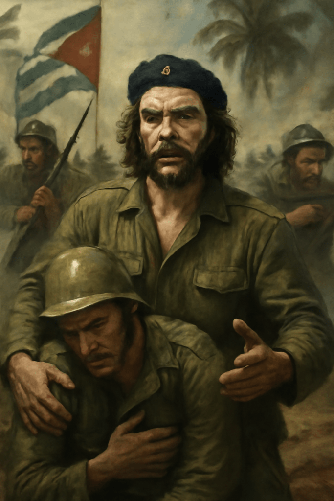 Tra il fumo e il fragore della battaglia, Ernesto “Che” Guevara cura un ferito sotto il fuoco nemico.