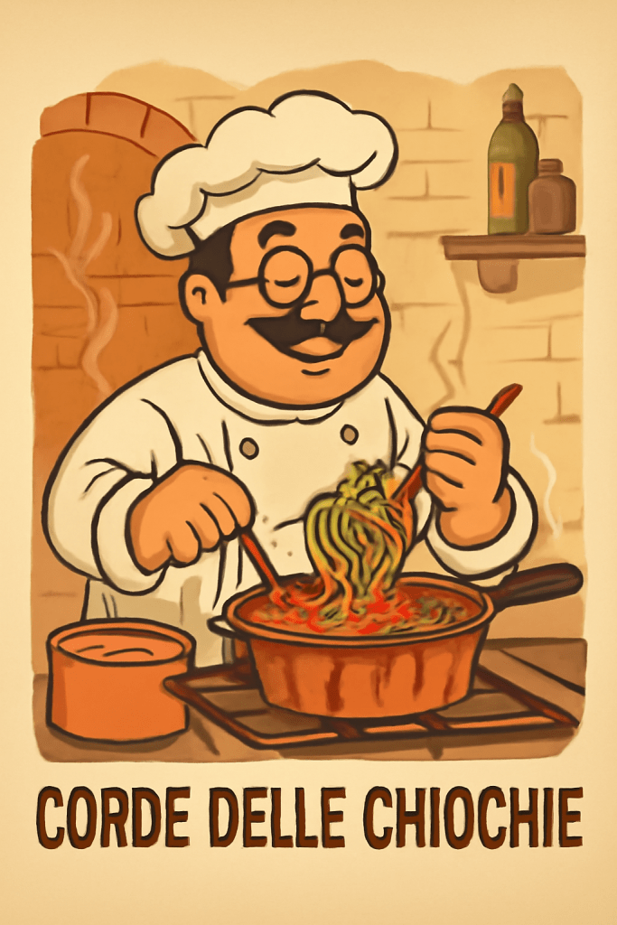 Il nome “Corde delle Chiochie” deriva dalle chióchie, calzature tradizionali dei pastori, che erano formate da stringhe di cuoio, richiamando la forma di questa pasta. Nella valle del Sagittario, in provincia di L’Aquila, il piatto è noto anche come “stringhitelle”, da “stringhe” o “lacci”. Questo piatto è il perfetto esempio di come la cucina abruzzese racconti una storia di povertà trasformata in arte culinaria attraverso la maestria degli ingredienti e dei gesti quotidiani.