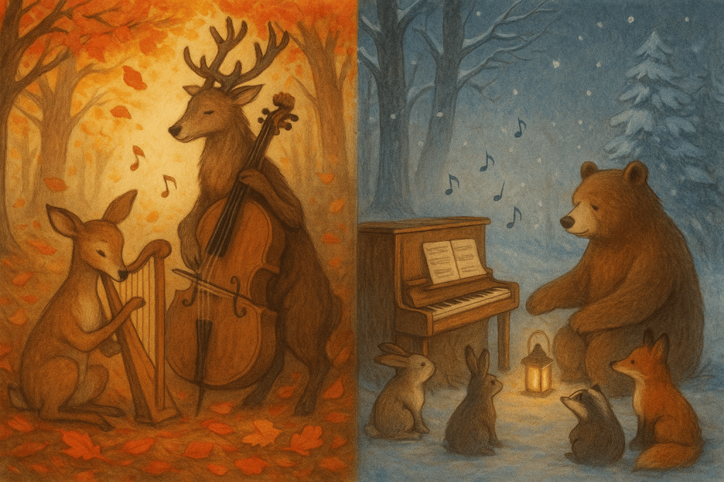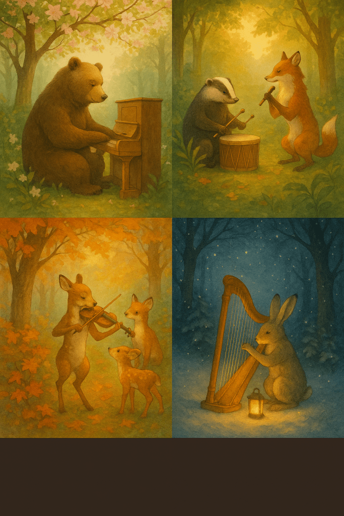 Dopo il grande concerto della foresta, la musica continuava a vivere, non solo tra gli strumenti, ma dentro ogni cosa: nei rami che si piegavano al vento, nelle foglie che cadevano leggere, nei ruscelli che scendevano cantando verso valle.