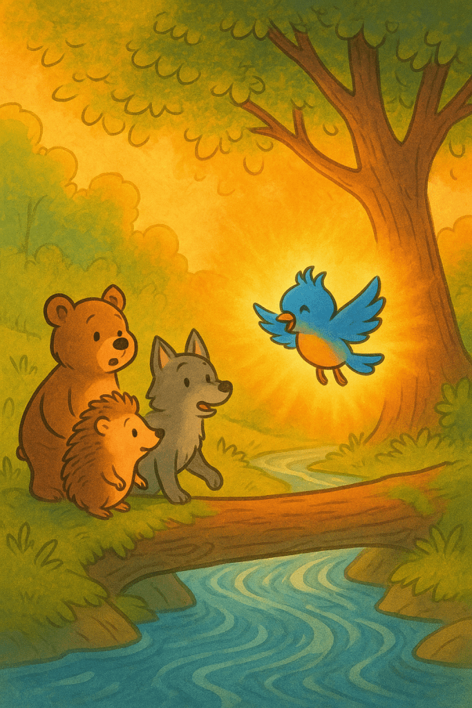 Dopo aver riportato nel bosco il rosso del coraggio gentile, i quattro amici sentirono una nuova forza dentro il cuore.