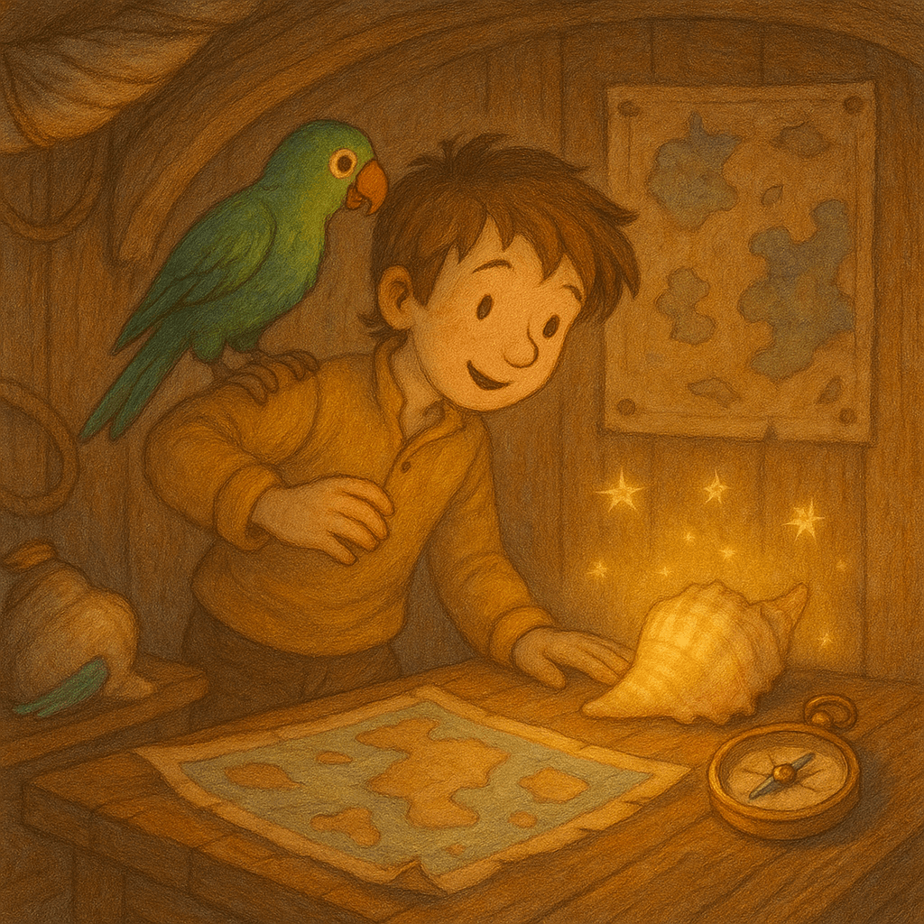 La aprì piano e scoprì una cabina piena di oggetti strani: conchiglie luminose, mappe piene di isole che cambiavano forma, e una bussola che… non puntava al nord, ma verso il mare aperto, come se avesse una volontà propria.