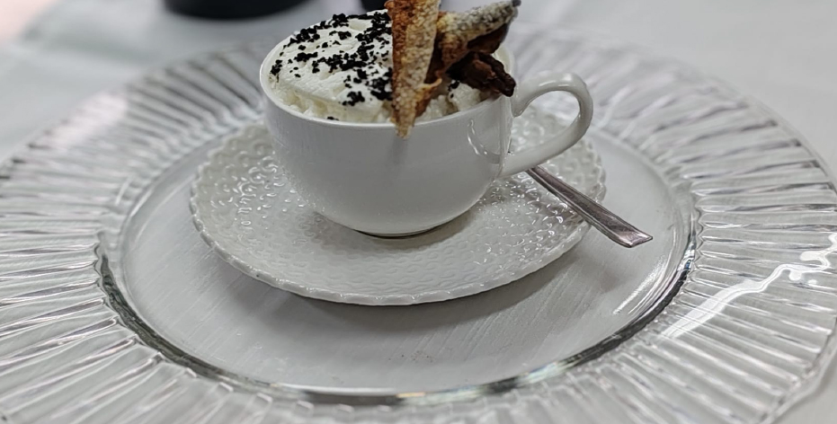 - Impiattamento “da cappuccino”: in tazza da cappuccino emulsione, trota, spuma al timo, polvere di porcini, un filo di EVO; pelle croccante servita a parte.