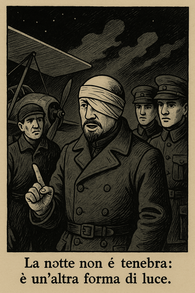 «Bevilacqua, notte del 16 gennaio 1916 — una raffica nemica colpisce il Vate in volo.»