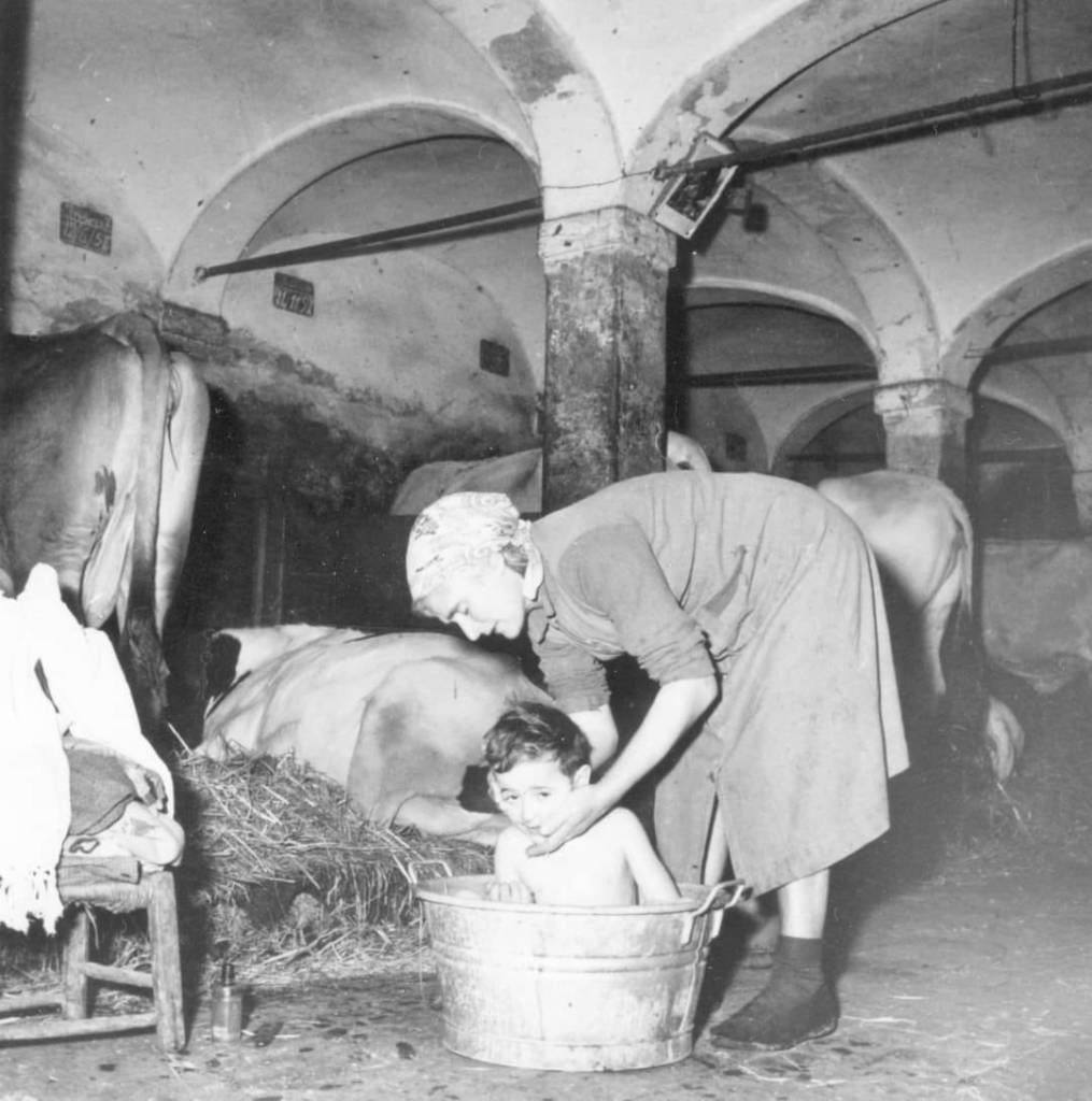 In questa fotografia, una madre lava il suo bambino in una vasca di metallo, circondata da un ambiente di stalla, con le mucche che ruminano tranquillamente sullo sfondo. Un gesto tanto semplice quanto ricco di significato, che ci parla di una quotidianità fatta di poche cose, ma di un valore immenso. La vasca non era solo un luogo di igiene, ma uno spazio di intimità familiare, un atto di cura e di amore che accomunava le generazioni.