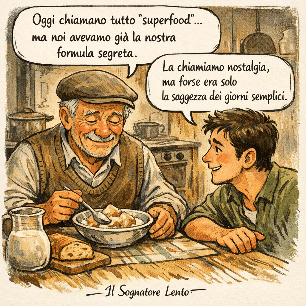 Non si trattava di bontà ricercata, di quelli che oggi chiameremmo “superfood”. Non c’erano avena, quinoa, frullati di chia o yogurt greco. C’era solo pane, quel pane che, quando diventava vecchio, non veniva buttato via, ma trasformato. E il latte, che magari non era sempre fresco, ma che riempiva la casa di quel profumo di conforto che solo il latte caldo sa dare. Un gesto che oggi ci può sembrare rozzo, ma che al tempo era simbolo di un mondo che sapeva come nutrire l’anima, oltre che il corpo.