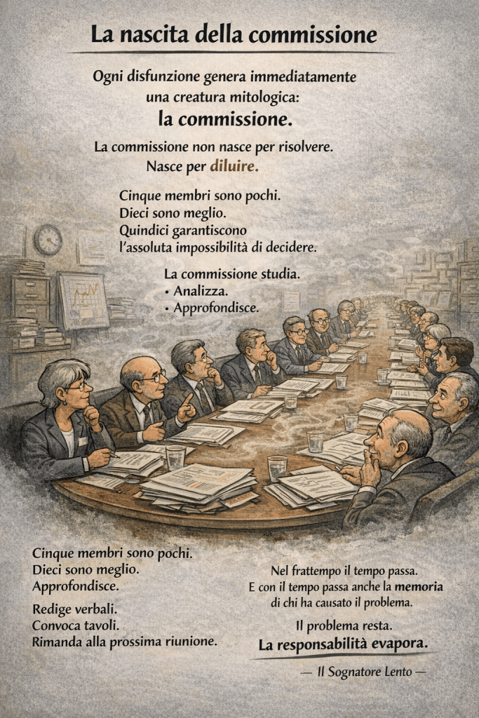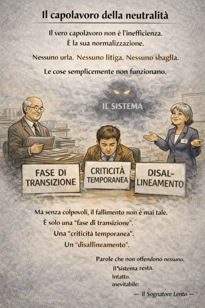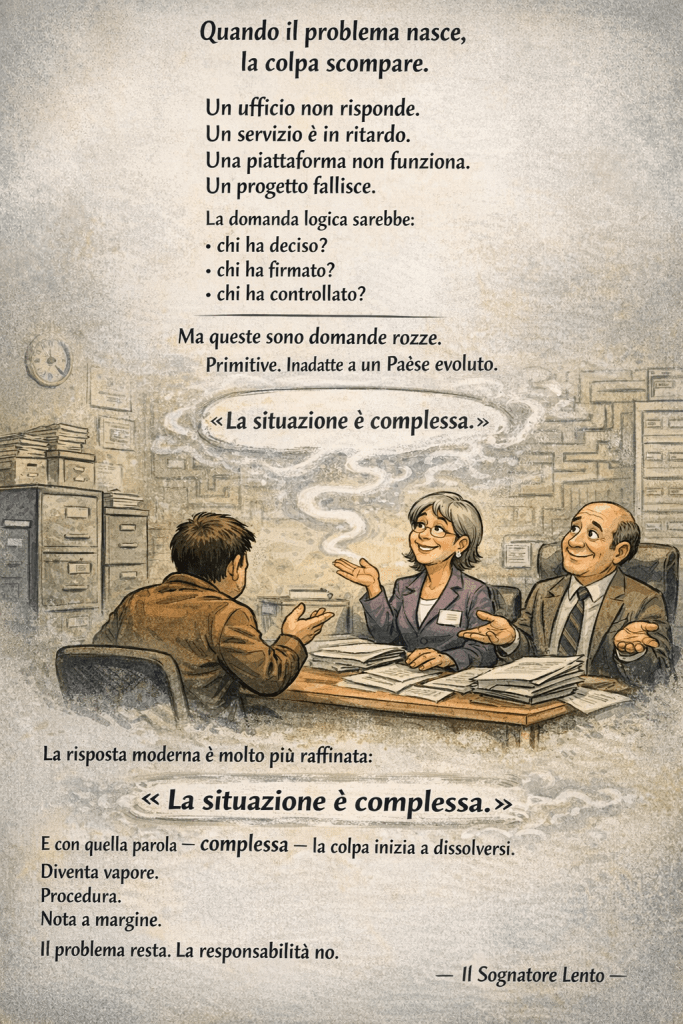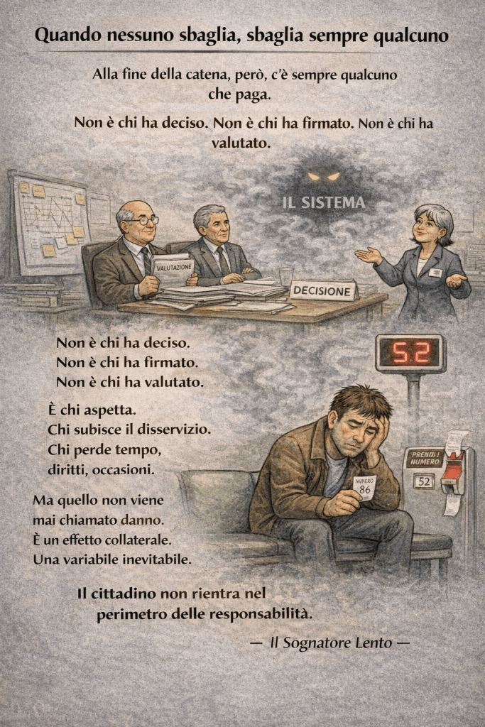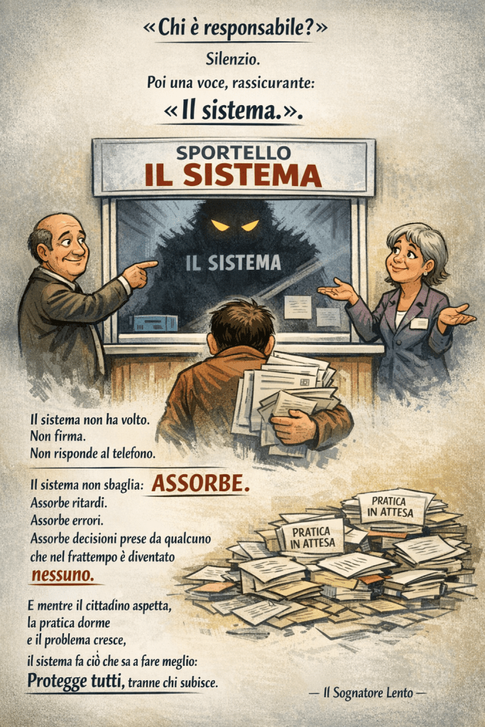 Un’entità astratta, impersonale, inafferrabile, che assorbe ogni colpa come una spugna e restituisce solo parole.
